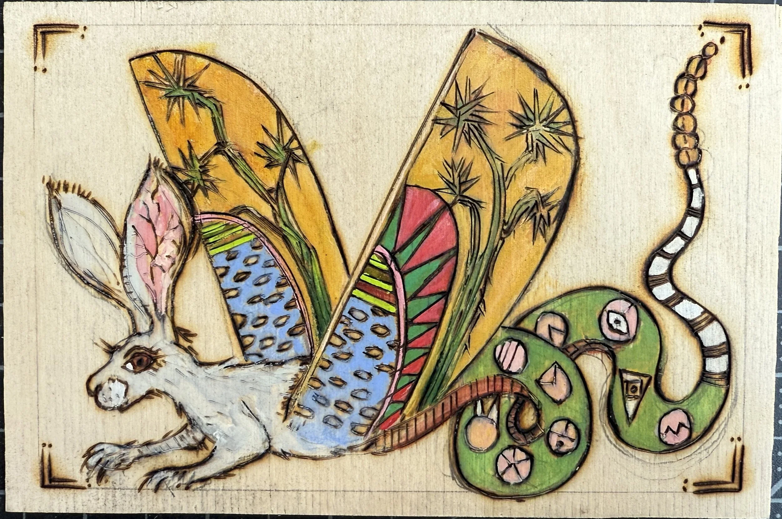 Below are some of Steffi’s pyrographic panels inspired by a visit to the British Museum’s Egyptian galleries. She spent hours finding rabbits painted on sarcophagus’ and mummies. More Egyptian-inspired pieces can be seen in